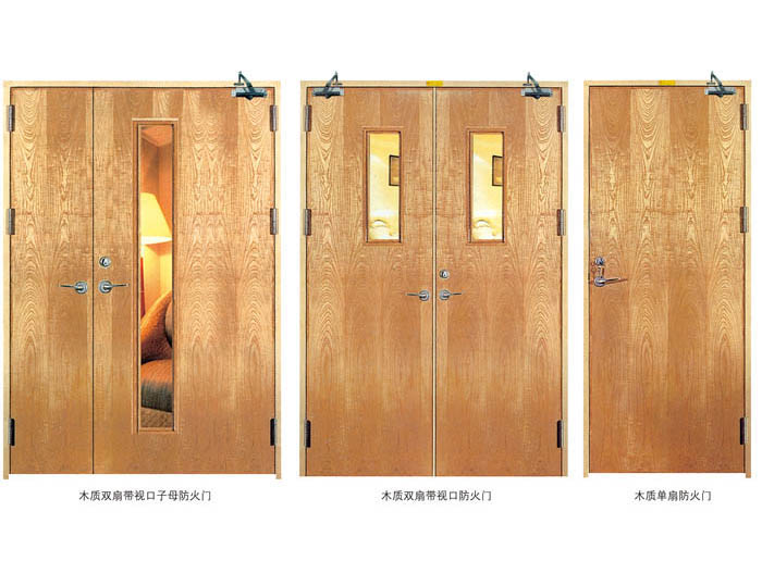防火門主要有鋼質防火門和木質防火門,另外也有鋼木質和不銹鋼防火門,但后者使用較少,如有配置使用一般會較說明;通常建筑圖紙中會給出材料的選擇,如沒有提示,常規的設計為室外一般采用鋼質防火門,如外疏散樓梯、天臺出口門、倉庫車間配置的防火門、配電房、電梯室和一些特殊的室內部位,如機房、柴油機房、地下車庫等。木質防火門主要設置在建筑物內部,如樓梯口、管道井、電梯前室及KTV、電影院、網吧等處的包箱門。