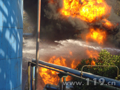 南京市雨花臺區(qū)梅山化工有限公司一儲油罐爆炸起火。南京市消防支隊接警后一次性調(diào)集特一、安德門、石門坎和梅山一、二中隊共5個中隊,18輛消防車、93名消防員趕赴現(xiàn)場處置。